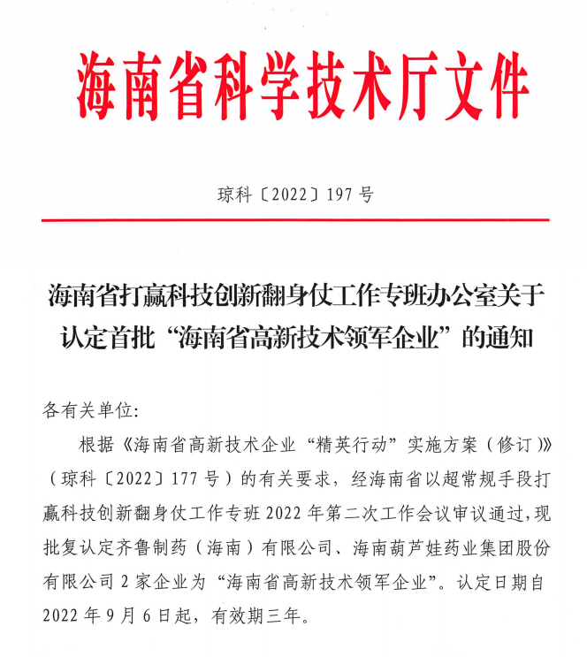 近日,海南省科学技术厅发布的《海南省打赢科技创新翻身仗工作专班办公室关于认定首批“海南省高新技术领军企业”的通知》中显示,批复认定海南AG百家家乐药业集团股份有限公司等2家企业为“海南省高新技术领军企业”。认定日期自2022年9月6日起,有效期三年。
